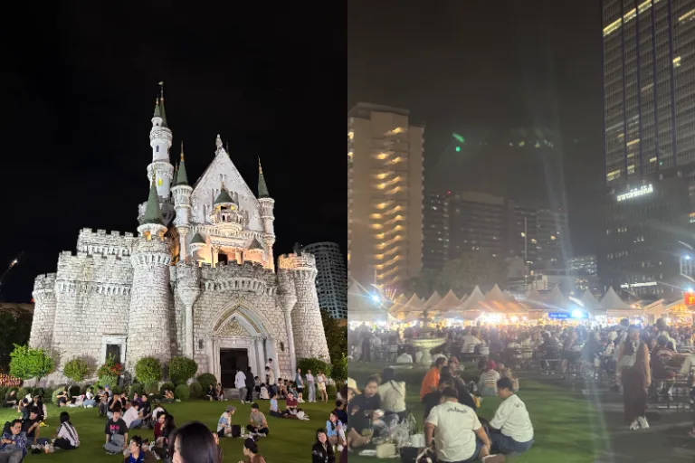 酒足饭饱后,要直奔超有氛围感的城堡夜市(Liabduan Danneramit Night Market)。这座夜市以一座巨大的城堡为中心,非常适合拍照打卡。夜市里有各种美食,我们品尝了各种炸物小吃,氛围超级热闹,因为我们还看到一群当地年轻人跳舞。大家都很 Chill 地坐在中央的草地上,一边享用美食一边感受夜晚的凉风,气氛直接拉满!