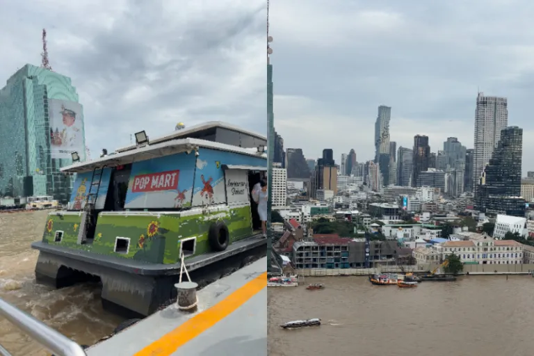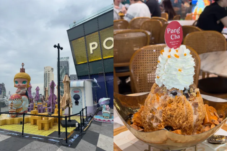 除了正餐,我们还体验了超人气的 Pang Cha 泰式冰沙,虽然价格有点贵,但份量足够,四个人吃到来刚刚好,非常值得一试!此外,7 楼的空中楼台还可以俯瞰曼谷城市景观和湄南河(Chao Phraya River)的绝美全景。如果你是盲盒控,那可一定要来7楼超大的 Pop Mart 旗舰店逛逛,这里还有提供甜品和饮料的 cafe 。