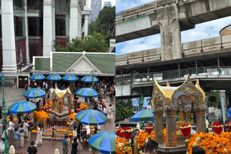 一早,我们搭地铁到 Chit Lom 站,步行就能到达著名的四面佛。这里有很多信徒前来朝拜,可以感受到泰国浓厚的宗教氛围和信仰力量。现场有出售茉莉花环和各种祭拜用品,而且还能看到许多信徒专程前来还愿,场面非常庄严,是感受当地宗教文化的绝佳地点。