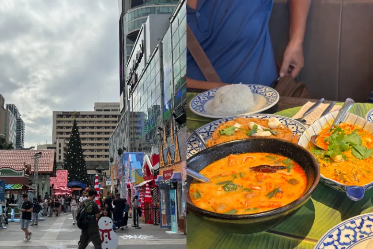 四面佛附近就是购物中心,我们逛 Central World 时,当时正值圣诞节,主题竟然是迪士尼!商场外被迪士尼人物装饰得非常梦幻,随手一拍都是浓浓的节日氛围。我们在商场里的 RosNiyom 享用午餐,点了东炎汤、咖喱虾、猪肉欧姆蛋和炸鸡翅,味道超级棒,补充了满满的能量!这趟午餐花费了 960 Baht (约 RM124.38)。
