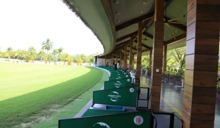 Located in Iskandar Puteri, Forest City Golf Resort features a 400-yard driving range with 26 double-sided covered bays that protect from the elements. Prices remain competitive at RM15 per 100 balls, with club rentals available at RM15 per club.