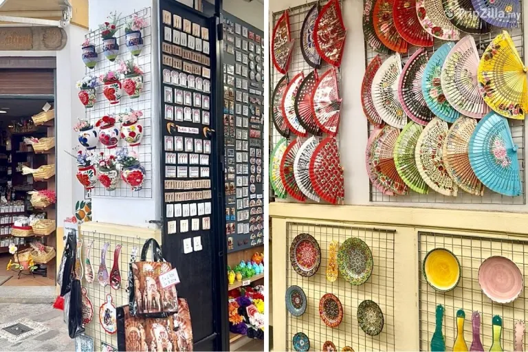 Untuk perjalanan ke destinasi seterusnya, saya sempat berhenti di sebuah lorong kecil untuk merakam gambar bersama poskad saya — ayyy cantik! Kami kemudian berjalan-jalan di deretan kedai cenderamata, yang mempamerkan pelbagai barangan berwarna-warni dan kipas tangan menarik perhatian saya. Kipas itu bukan sekadar cenderamata kerana dengan suhu mencecah 38°C pada petang itu, ia menjadi keperluan penting untuk bertahan di bawah terik matahari Andalusia.