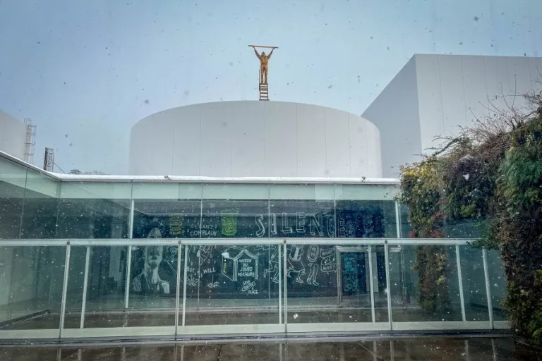 除了这一标志性景观及其他引人入胜的常设展品——如让·法布尔(Jan FABRE)1998年的作品《测量云彩的人》(The Man Who Measures the Clouds)——馆内还会定期举办各类前卫的特展。我们到访时,正巧看见两个当地男孩在馆外打雪仗,他们的身影倒映在美术馆长长的玻璃幕墙上,与现代建筑构成了一幅极具动感的冬日画卷。