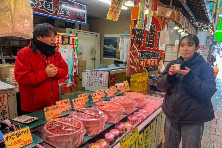 大多数摊位和商店的营业时间为 09:00 至 17:00,不过传统的摊位通常会在下午中后期就开始陆续收摊,建议尽早前往。这里的店主们热情健谈,我们到访时,不仅获赠了美味的盐渍虾和鱿鱼试吃,摊主还根据我的口味给出了专业的清酒选购建议。如果你在市场内的餐厅坐下来享用午餐,说不定还能和邻座的当地食客聊成朋友呢。
