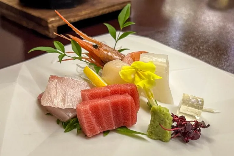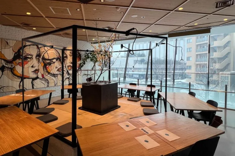 虽然近江町市场的美食选择已经多不胜数,但附近的时尚购物中心“Hakomachi”内还隐藏着另一个绝佳选择:Coil。这家近期焕新开业的餐厅兼茶室提供极具特色的“DIY 寿司”体验,将餐饮转化为一场有趣的互动艺术。我们坐在和洋折衷的设计空间里,透过巨大的落地窗,金泽银装素裹的雪景尽收眼底。这里的菜单极其丰富,从经典的鱿鱼、三文鱼到独具创意的牛油果、金枪鱼生火腿,甚至还贴心地准备了纯素(Vegan)选项。