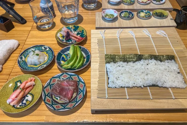 用餐仪式感从上菜那一刻便已开启。店员会呈上一个巨大的木质礼盒,拉开移门,里面整齐摆放着琳琅满目的配料、两款寿司的制作基底以及热气腾腾的现炸天妇罗。在品尝完酥脆的天妇罗后,我们便开始动手制作细卷和军舰卷。只要控制好配料的分量,即便是新手也能轻松做出颜值极高的寿司。店内精选的当地清酒更是点睛之笔,与手作料理堪称绝配。