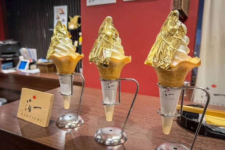 穿过街道上熙熙攘攘的旅拍人群,我们来到了“箔一”东山店 (Hakuichi),这里便是大名鼎鼎的“金箔冰淇淋”诞生地。金箔是金泽的灵魂工艺,在这一带的商店里,从镶金的漆器、玻璃器皿到金箔成分的护肤品,无处不在。小剧透: 实际上金箔本身并无味道,但那口感浓郁的牛乳冰淇淋确实是极品,而粘在嘴唇上的金箔更是绝佳的社交媒体打卡瞬间。