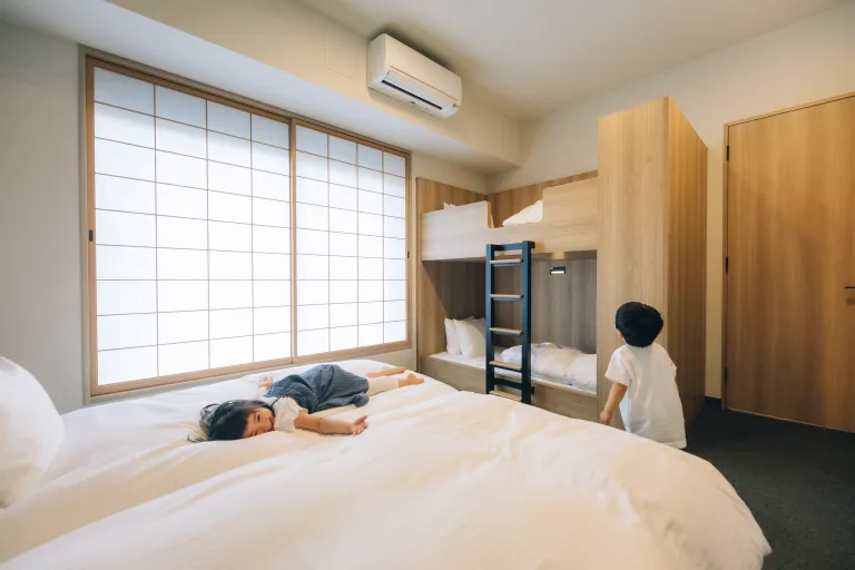 以 MIMARU 为例,其客房面积多为 40㎡以上,空间规划更接近真正的“家”。房内设有独立睡眠区,让大人与孩子能在同一空间休息却互不干扰;同时配备客厅与用餐空间,无论是全家一起吃早餐、整理行程,或让孩子在室内活动,都更加从容。