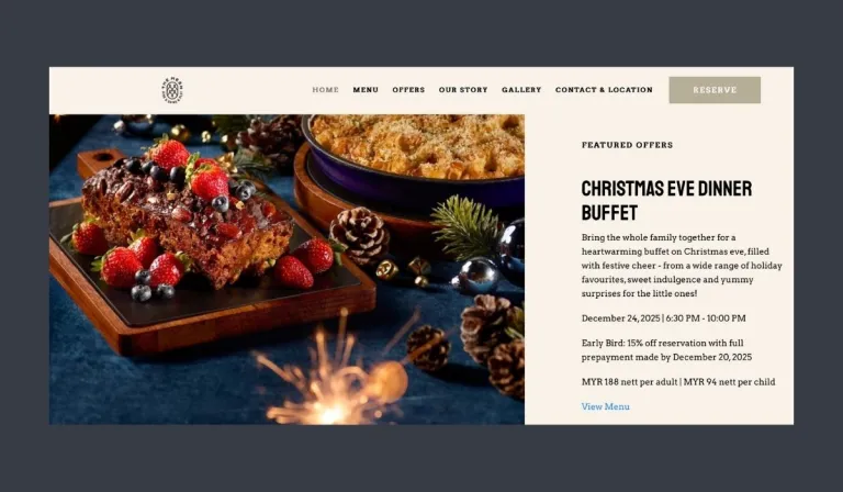要注意的是,整个十二月都有节庆主题。平安夜晚餐和圣诞节早午餐价格为 RM228+。如果想要更安静、性价比更高的选择,很多人推荐 RM138+ 的星期天早午餐。