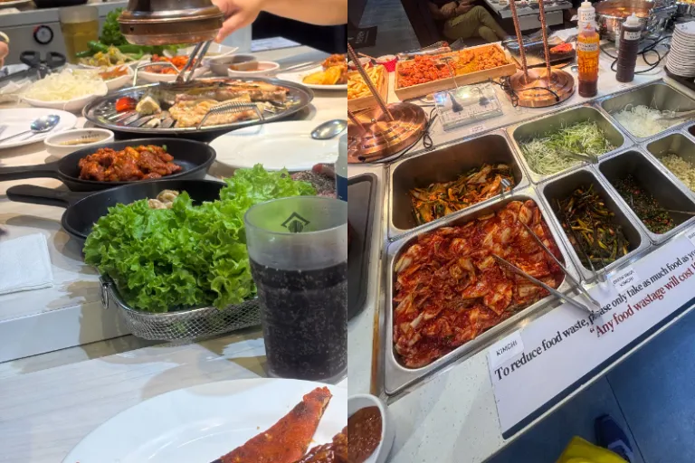 用餐过程中,店员会定时更换烤盘,让烤肉的味道保持干净不焦。将烤好的肉片放在生菜上,再搭配蒜片、辣酱或小菜一起包着吃,吃起来清爽不腻,也更有层次感。晚餐成人价格约 RM59.80。
