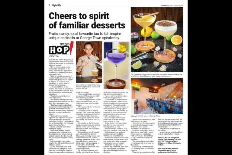 Guests consistently highlight "an incredibly unique cocktail experience" characterized by "personalized service, cozy decor, and laid-back vibe that encourages conversation without overwhelming noise". The Star newspaper and cocktail critics consider The Nest "one of Penang's top bars, not just because it's located in a beautiful restored Peranakan shophouse, but also for" its innovative approach to garnish pairing.