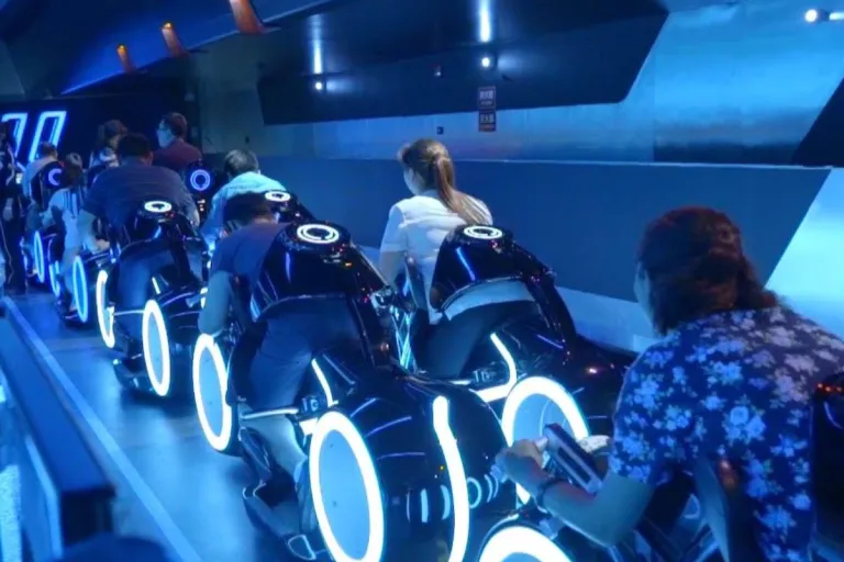 TRON是上海迪士尼的招牌刺激设施。你会趴在摩托型座位上高速发射,起步冲刺真的有破百公里的体感。