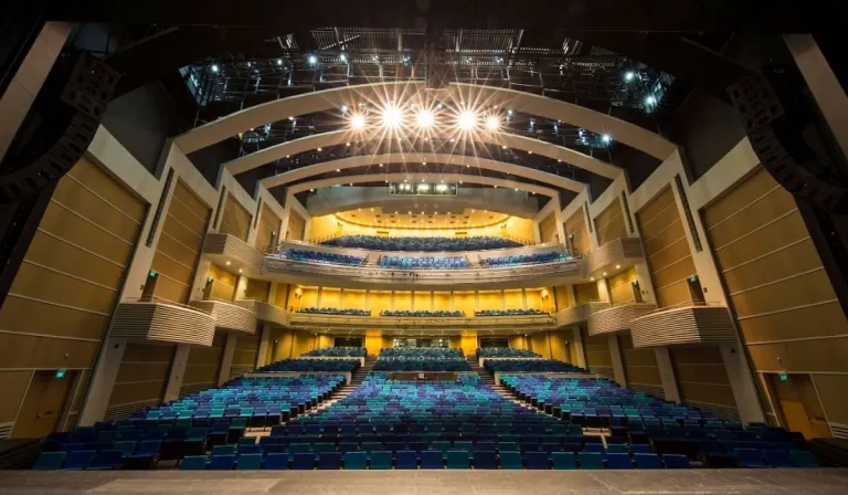 With a striking futuristic design, it houses a 1,600-seat concert hall and a 1,948-seat theatre, both featuring world-class acoustics and staging capabilities. The concert hall's acoustic canopy can be adjusted to ensure optimal sound for varying audience sizes.